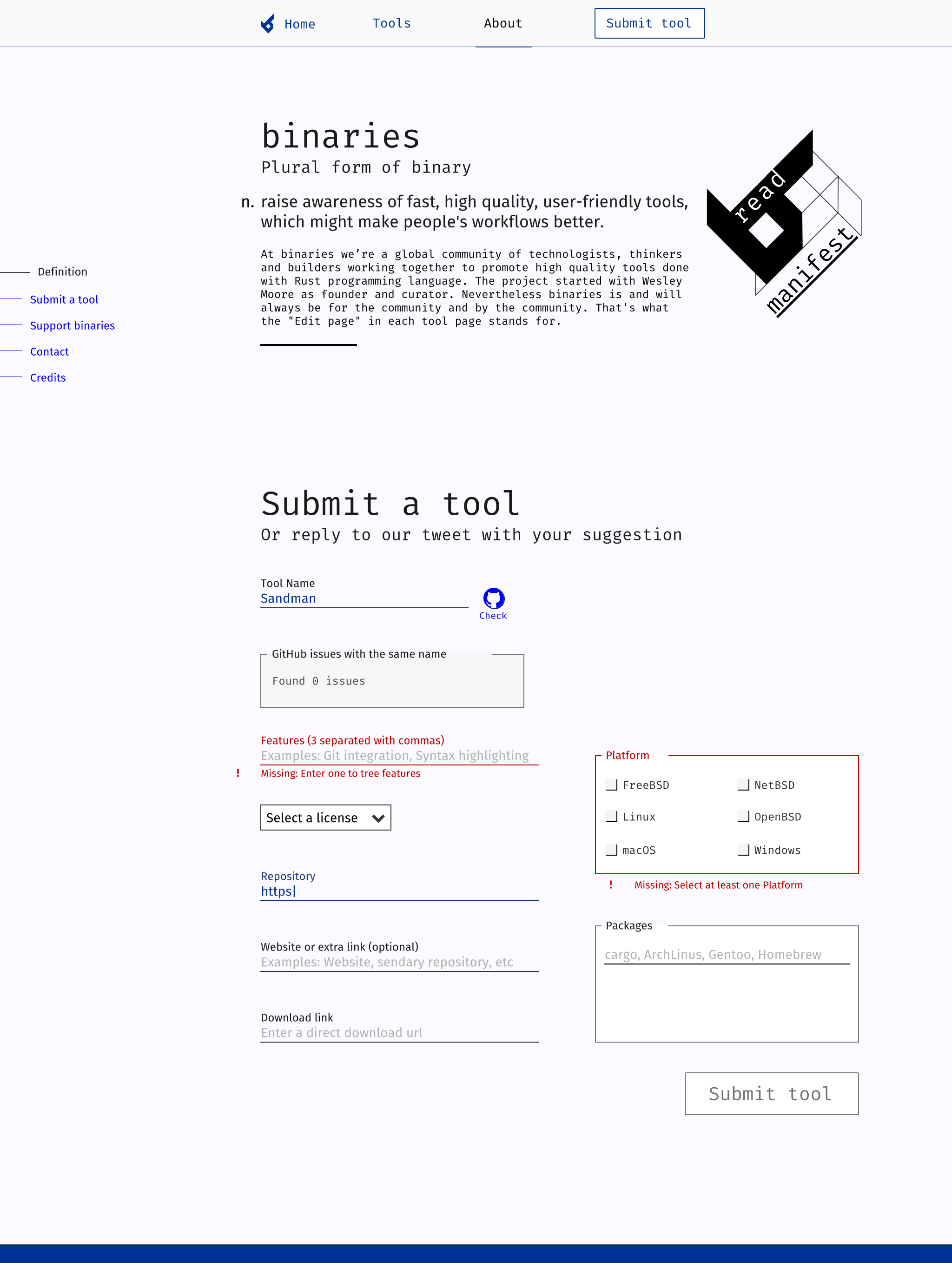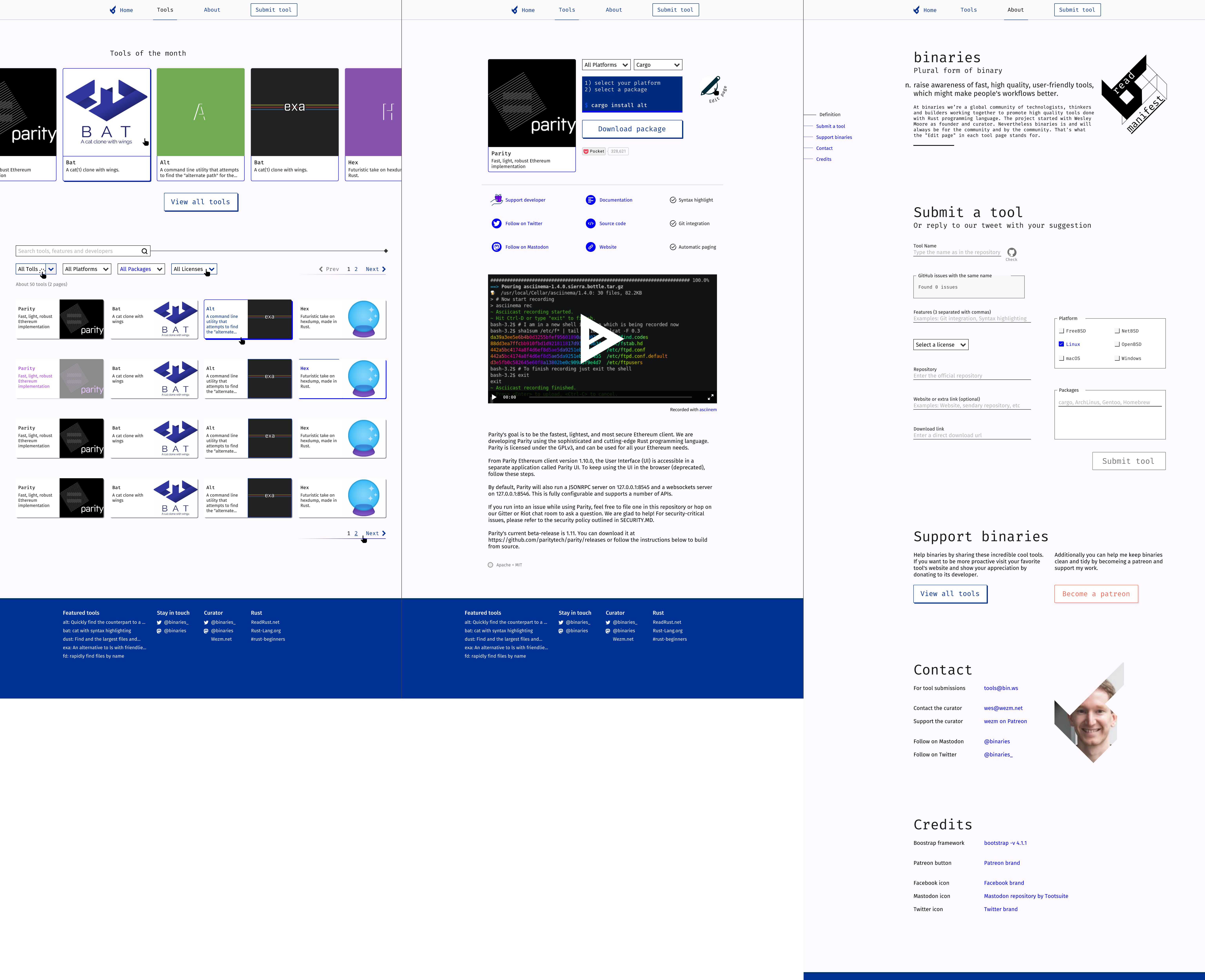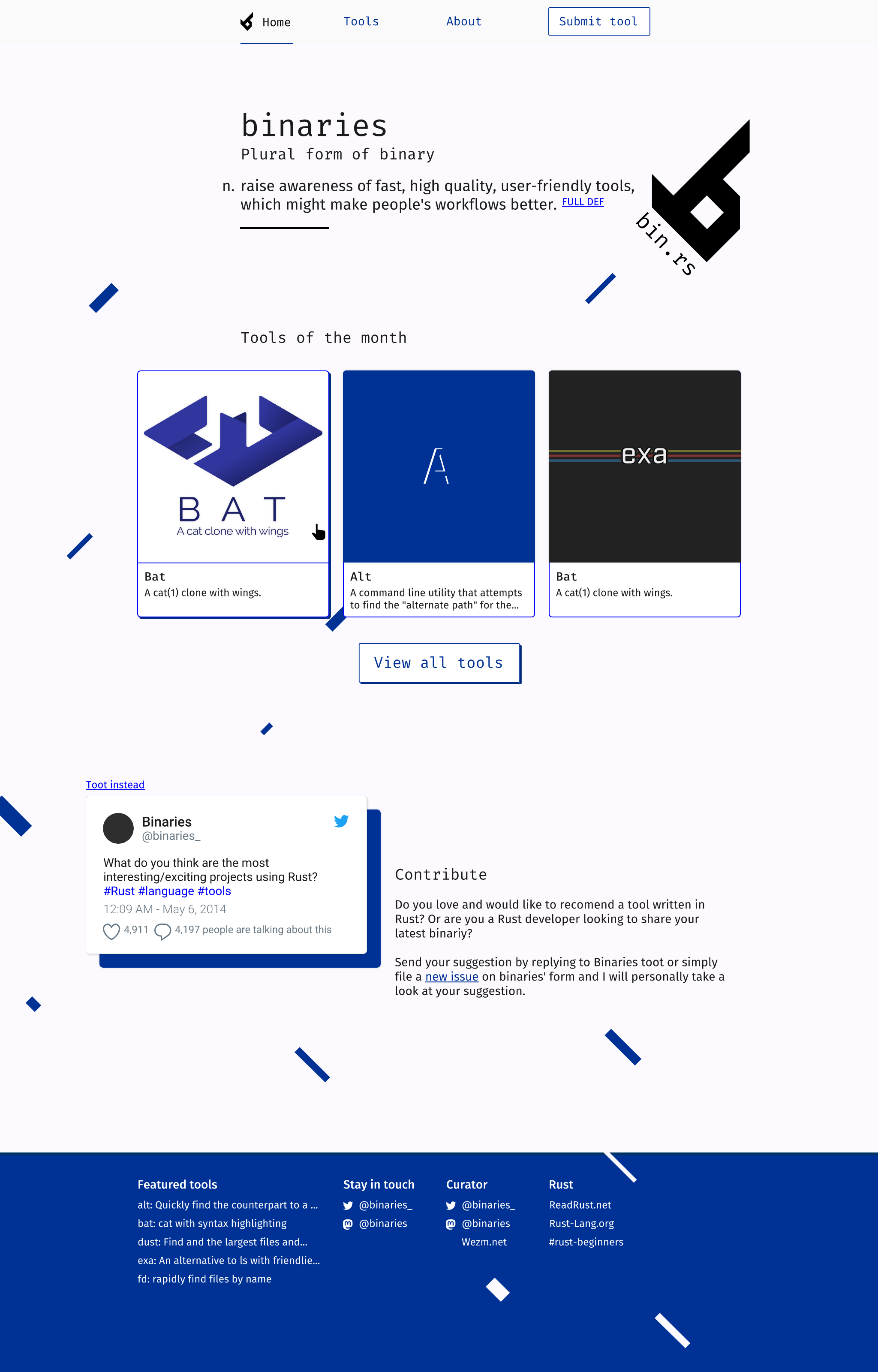 Visual identity and web design for bin.rs (binaries). Platform where the main goal is to promote the Rust programming language by showcasing a curated list by Wesley Moore of applications made with Rust.